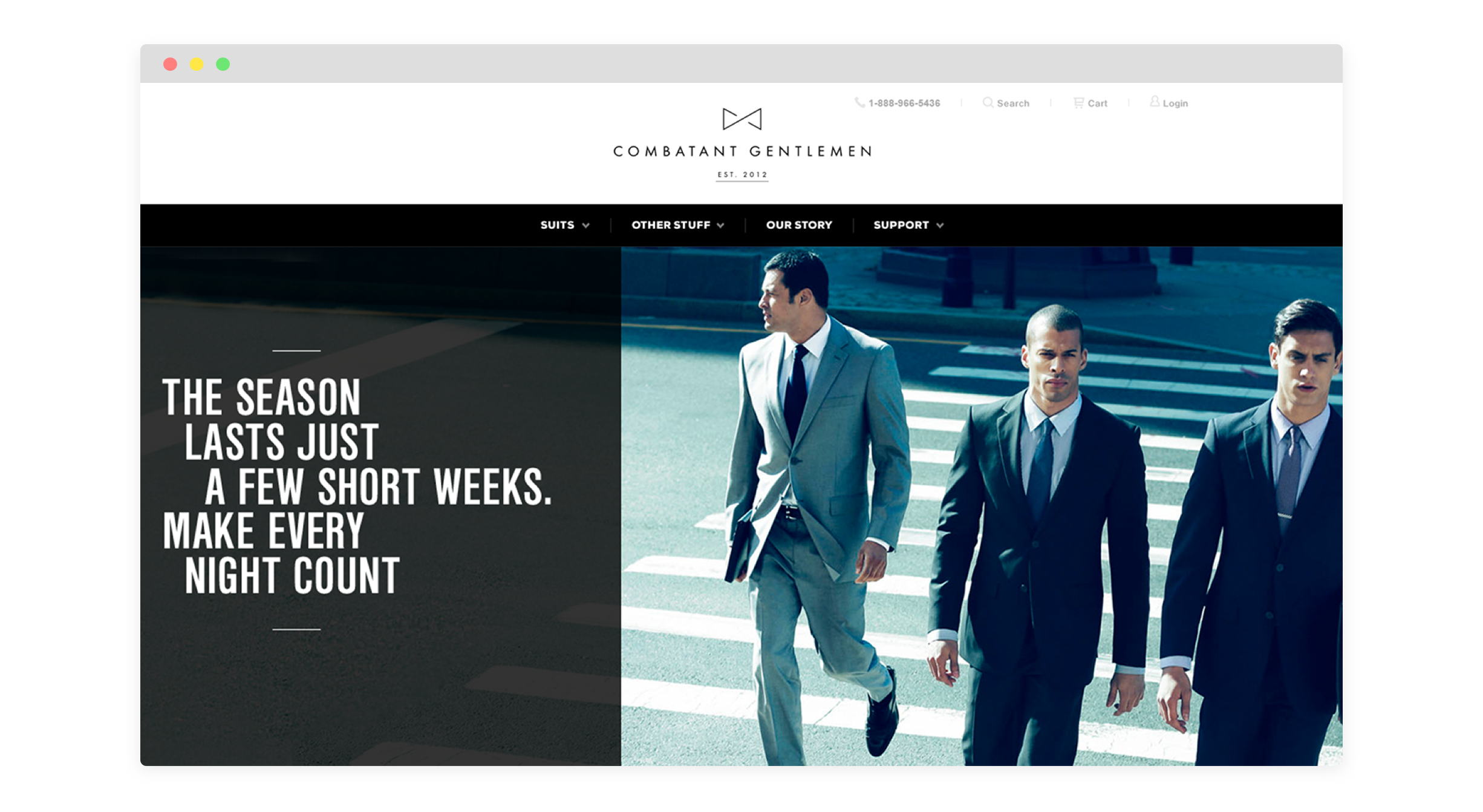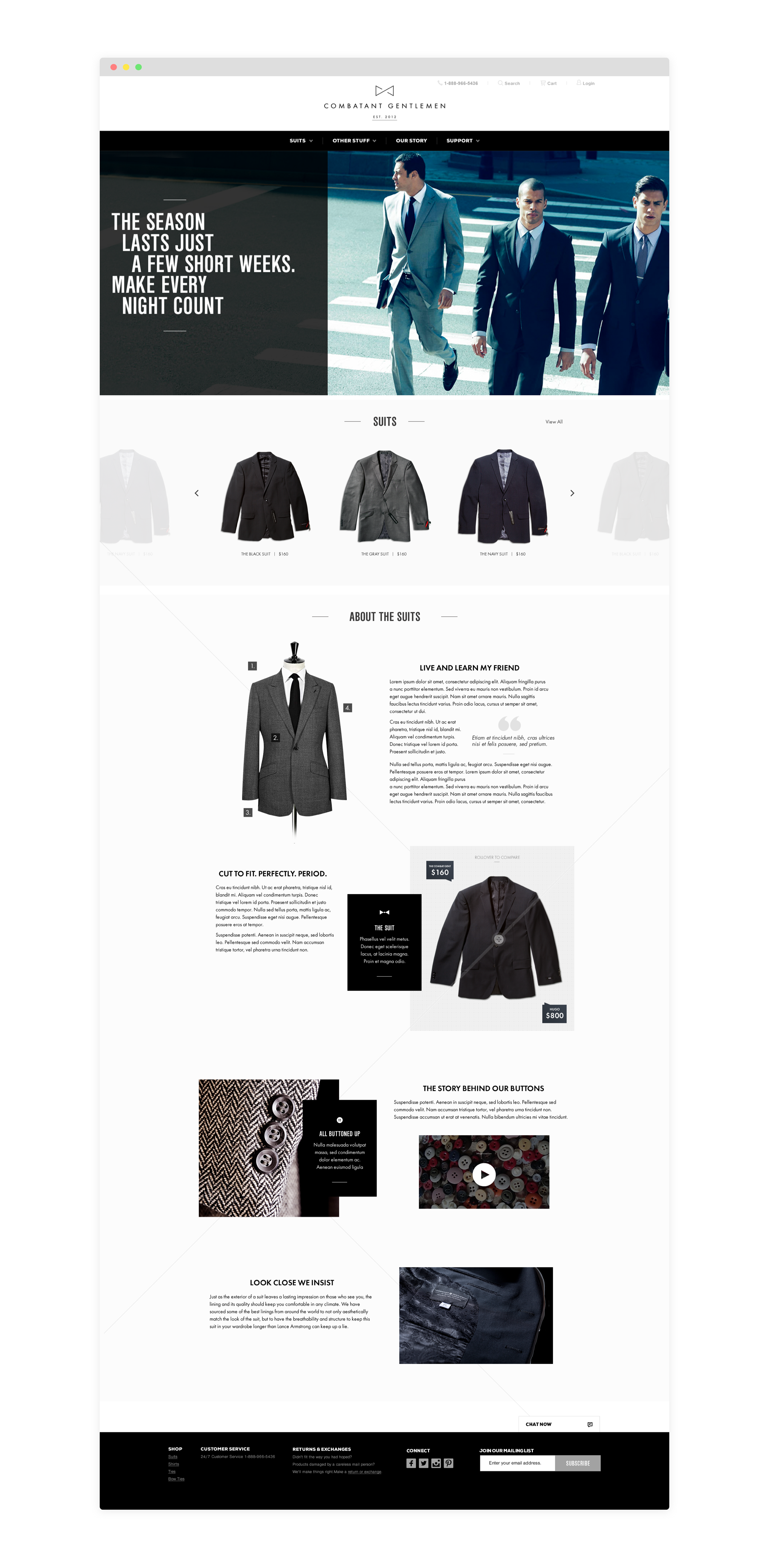 I created the logo and website for Combatant Gentlemen, a suiting start up company, with Plus in New York. I designed the entire e-commerce experience with loose wireframes and also provided art direction on potential images to use throughout the site and created brand guidelines for the company. The site has changed since I worked on this project but the core brand and identity that I established is still in use.